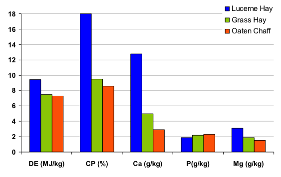 Figure 1: A comparison of the digestible energy (DE), crude protein (CP), calcium (Ca), phosphorous (P) and magnesium content of early bloom lucerne hay, grass hay and oaten chaff.