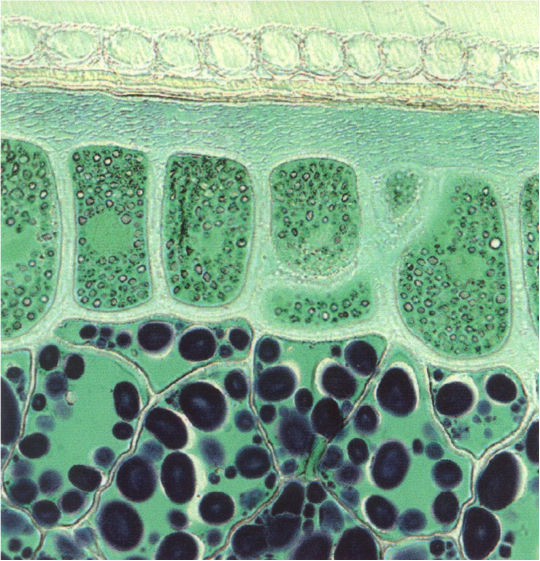 Figure 2: The location of starch granules (stained black) within the endosperm cells of barley grain surrounded by the protein matrix (stained green) and protected by the aleurone layer and seed coat.