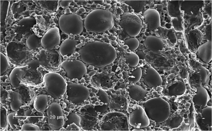 Figure 1: A scanning electron micrograph of the middle of a barley grain showing the starch granules embedded within the protein matrix. The starch granules are the large round objects.