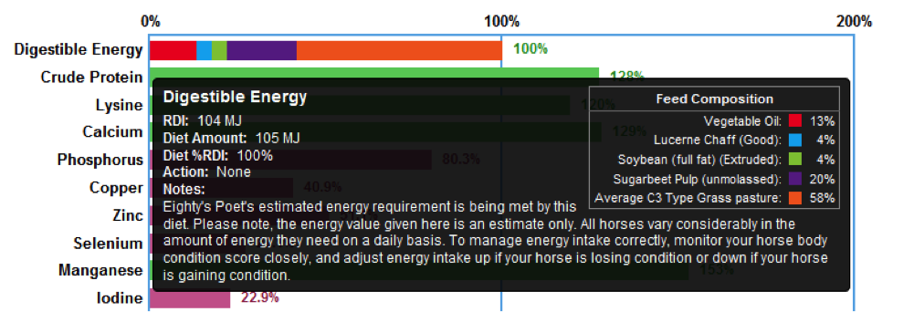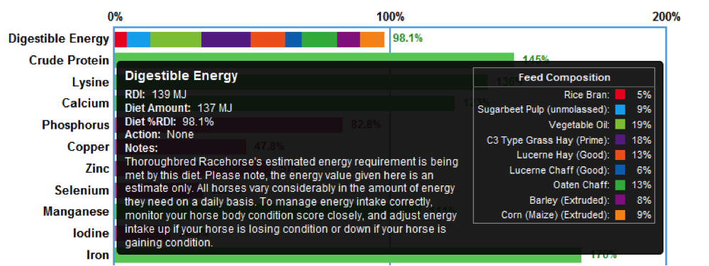 For horses affected by the RER form of tying up, you should try to keep the amount of energy supplied by grain based feeds to 20% or less of the total digestible energy intake. To monitor this in FeedXL, simply hover your mouse over the Digestible Energy bar in the graph for a full breakdown of where the energy is coming from in the diet (see the screen shot below). If your grain based feeds are supplying more than 20% of the digestible energy and your horse continues to be affected by tying up, reduce the amount of these feeds in the diet.