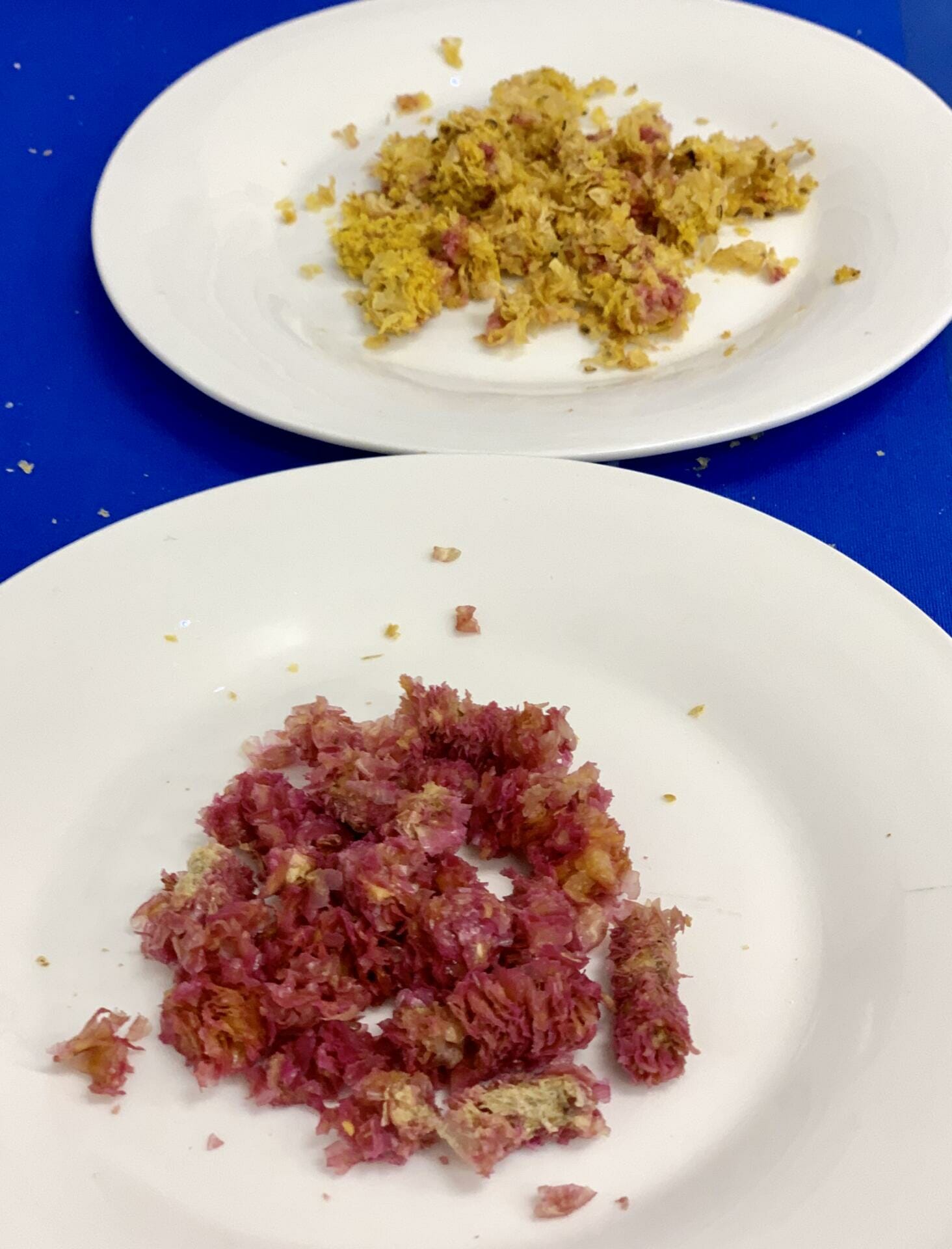 When soybean is PROPERLY cooked, there should be ZERO trace of pink, as shown in the sample on the right here of well extruded full fat soybean. The sample on the left is raw, ground full fat soybean. It is, of course, bright pink… just to show how much the bean itself reacts with this colour test BEFORE it is cooked.
