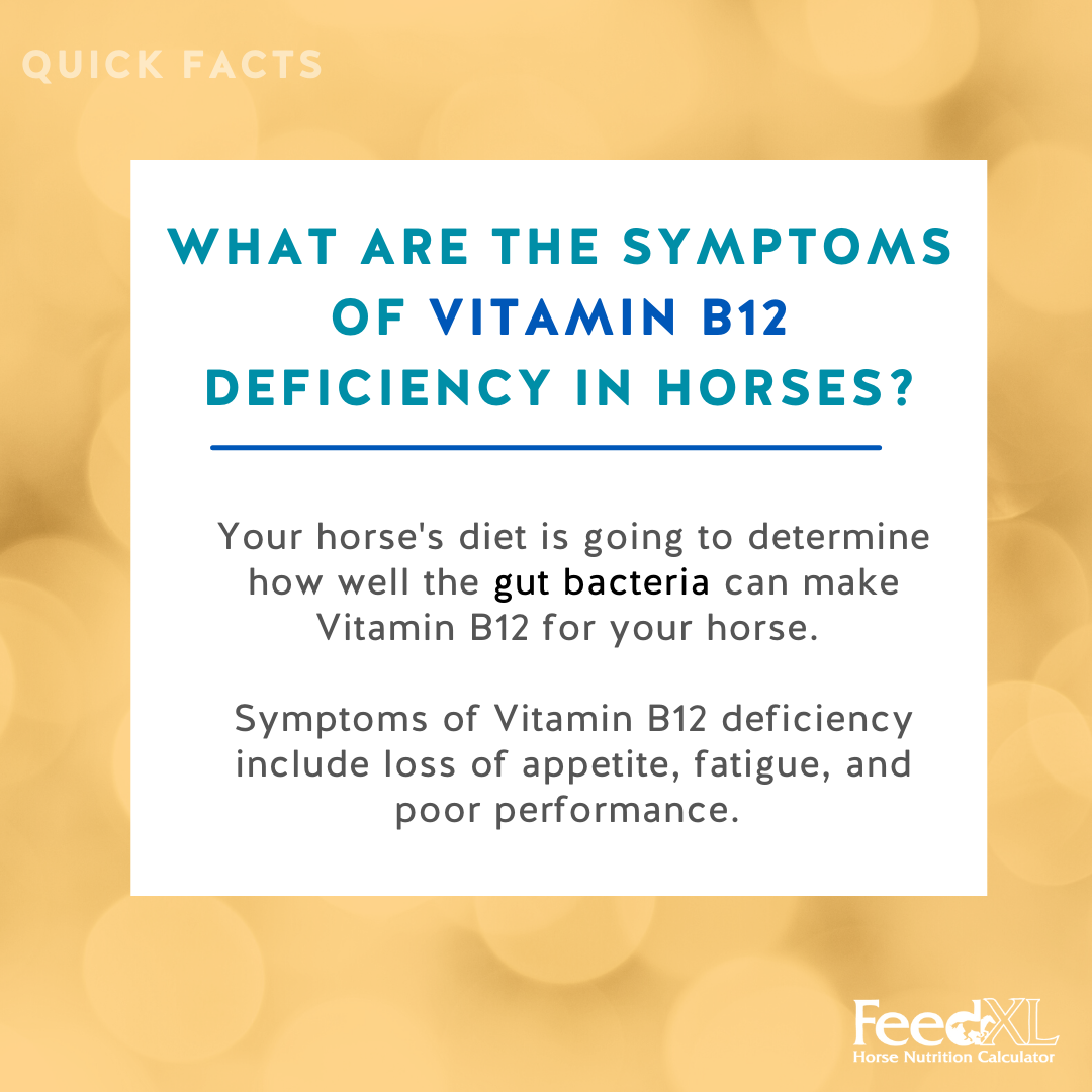 Loss of appetite is one symptom of a vitamin B12 deficiency. Fatigue and poor performance will also occur when a horse is deficient.