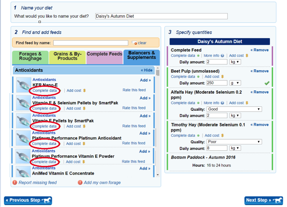 To find vitamin E-only supplements, click on ‘Complete Data’ which is located below the ingredient name when editing diets or browsing ingredients and FeedXL will show you which nutrients that product contains. (See the image in this post).
