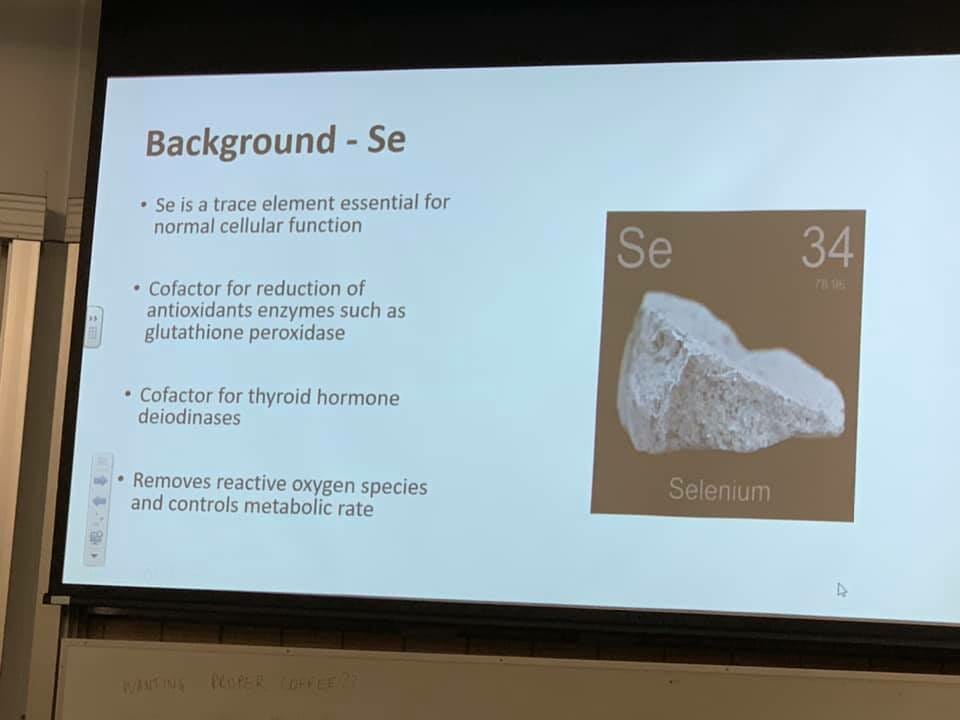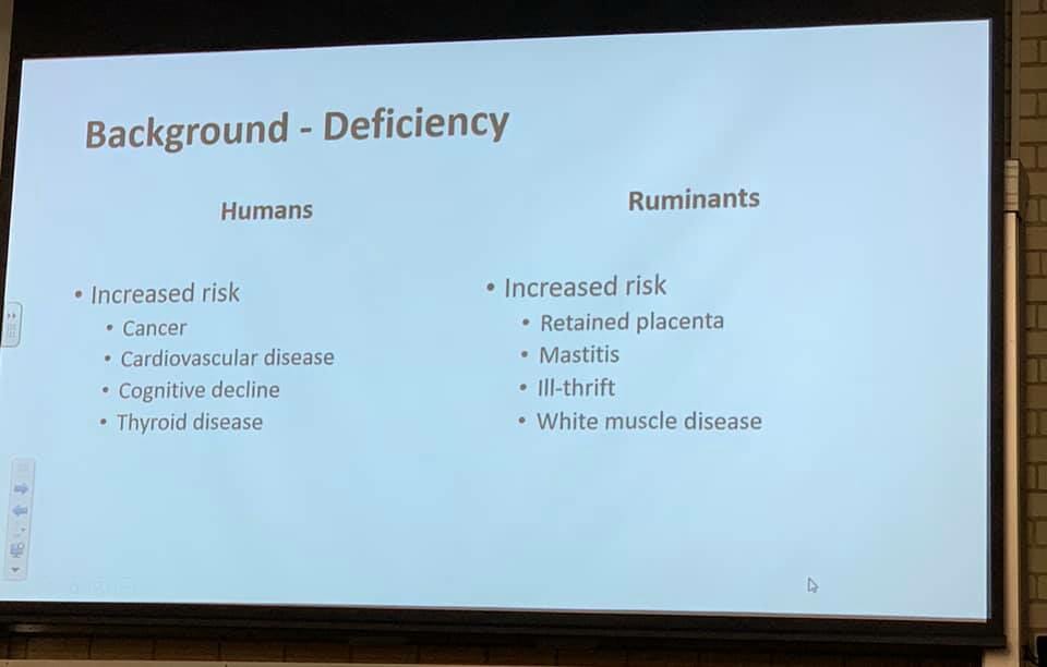 The cattle industry agrees. Professor Michael Lee of the University of Bristol spoke about selenium at an animal nutrition conference at the University of New England. Listed at the top of his list of symptoms of selenium deficiency in ruminants was retained placenta. Check out a sneak peek of his slides below.